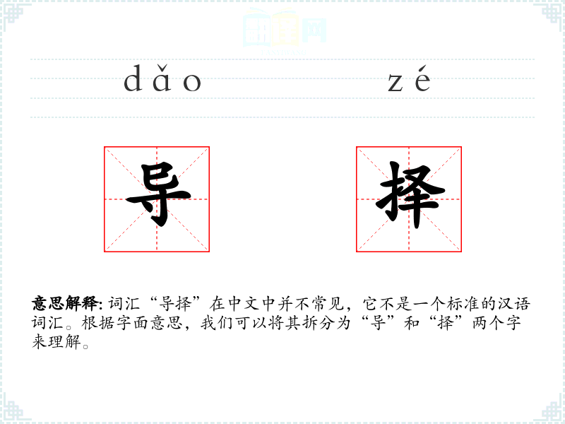 词汇“导择”在中文中并不常见,它不是一个标准的汉语词汇。根据字面意思,我们可以将其拆分为“导”和“择”两个字来理解。