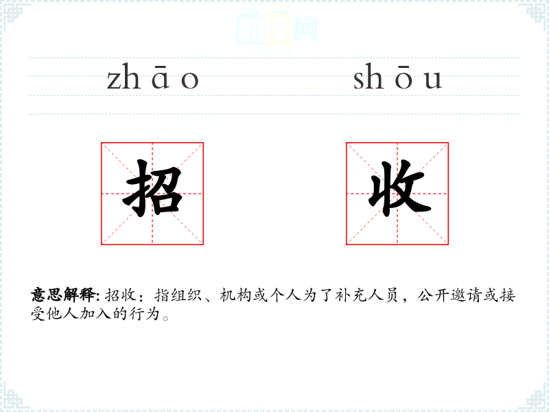 招收:指组织、机构或个人为了补充人员,公开邀请或接受他人加入的行为。