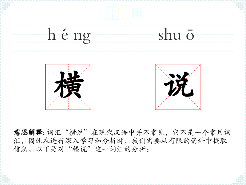 词汇“横说”在现代汉语中并不常见,它不是一个常用词汇,因此在进行深入学*和分析时,我们需要从有限的资料中提取信息。以下是对“横说”这一词汇的分析: