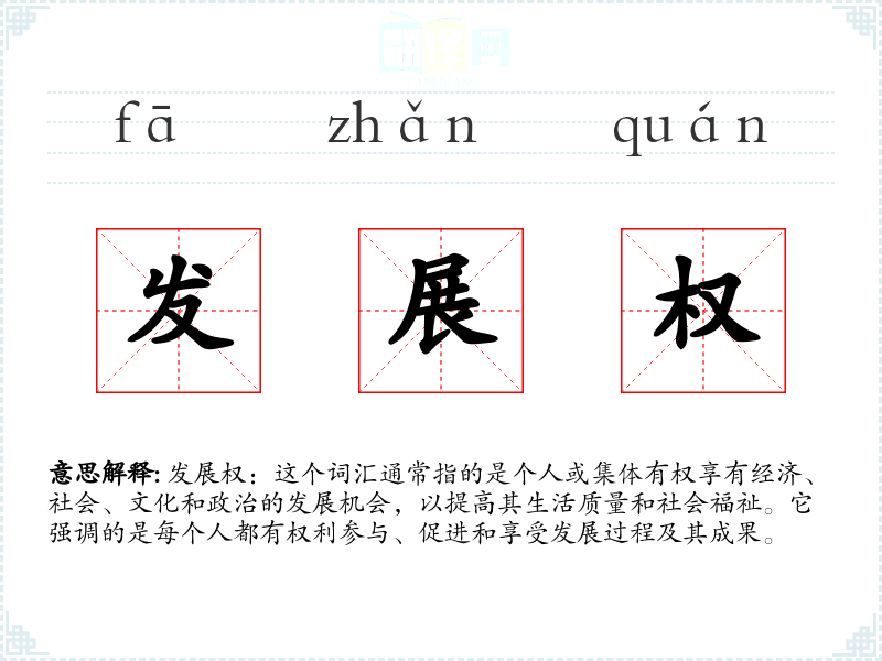 发展权:这个词汇通常指的是个人或集体有权享有经济、社会、文化和政治的发展机会,以提高其生活质量和社会福祉。它强调的是每个人都有权利参与、促进和享受发展过程及其成果。
