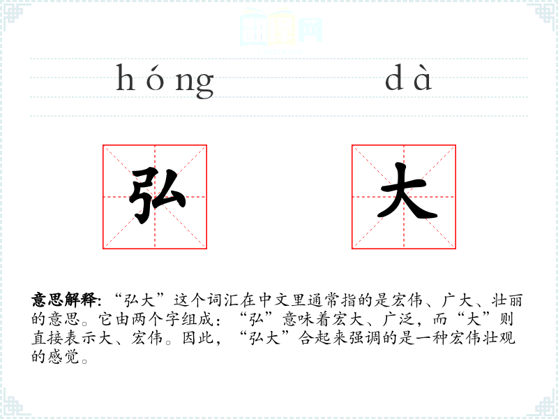 在日常生活中,我可能会用“弘大”来形容一次旅行中见到的壮丽山河,或者在描述一个宏伟的建筑项目时使用这个词汇。