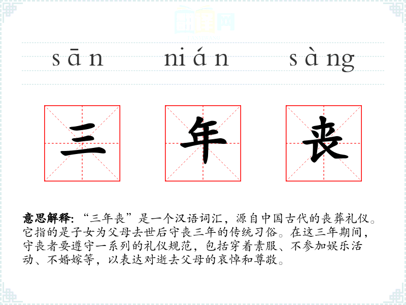 “三年丧”是一个汉语词汇,源自*古代的丧葬礼仪。它指的是子女为父母去世后守丧三年的传统俗。在这三年期间,守丧者要遵守一系列的礼仪规范,包括穿着素服、不参加娱乐活动、不婚嫁等,以表达对逝去父母的哀悼和尊敬。