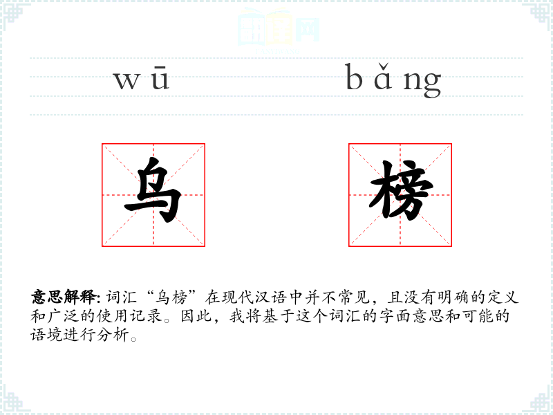 词汇“乌榜”在现代汉语中并不常见,且没有明确的定义和广泛的使用记录。因此,我将基于这个词汇的字面意思和可能的语境进行分析。