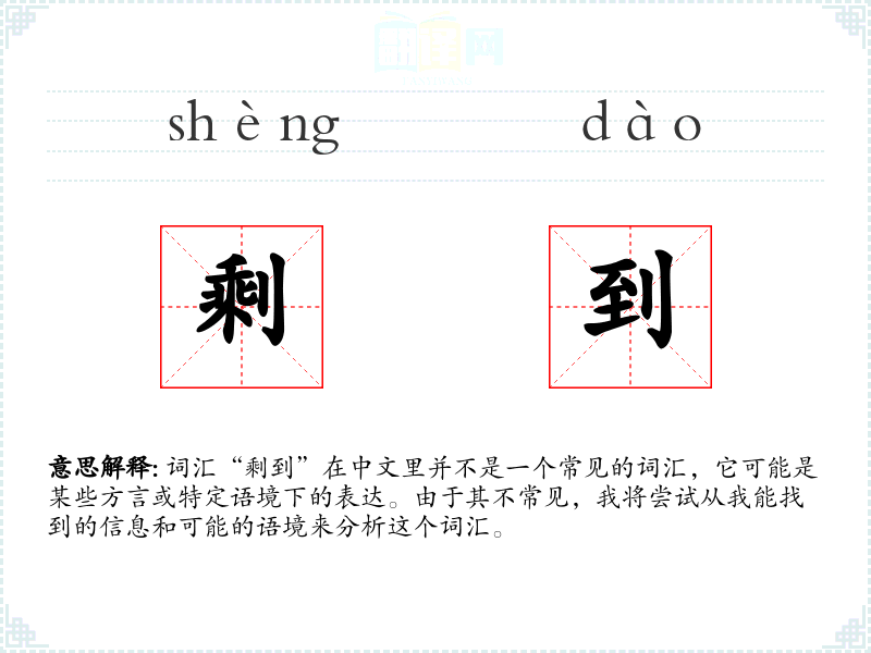 词汇“剩到”在中文里并不是一个常见的词汇,它可能是某些方言或特定语境下的表达。由于其不常见,我将尝试从我能找到的信息和可能的语境来分析这个词汇。