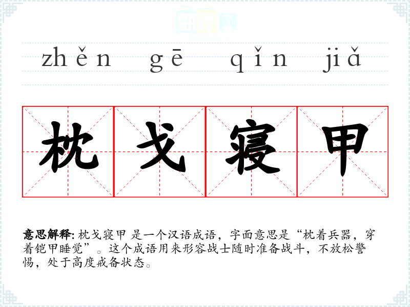 枕戈寝甲 是一个汉语成语,字面意思是“枕着兵器,穿着铠甲睡觉”。这个成语用来形容战士随时准备战斗,不放松警惕,处于高度戒备状态。