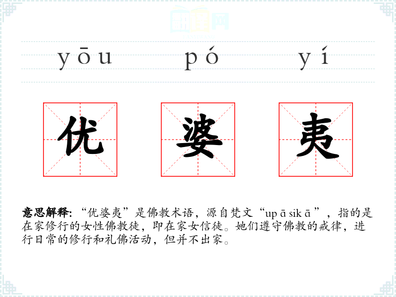 “优婆夷”源自梵文“upāsikā”,在传入后,这个词被汉语音译为“优婆夷”。随着在的传播和发展,这个词逐渐被广泛接受并使用。