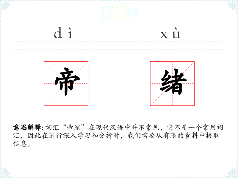 词汇“帝绪”在现代汉语中并不常见,它不是一个常用词汇,因此在进行深入学*和分析时,我们需要从有限的资料中提取信息。