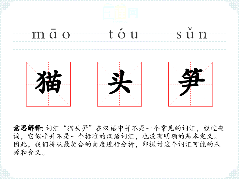 由于“猫头笋”不是一个常用词汇,它在不同语境下的使用非常有限。如果存在,可能是在某些地方方言中,或者是在特定的文学作品中作为比喻或象征使用。