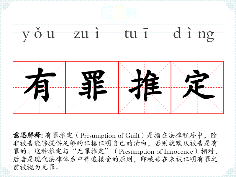 有罪推定(Presumption of Guilt)是指在法律程序中,除非被告能够提供足够的证据证明自己的清白,否则就默认被告是有罪的。这种推定与“无罪推定”(Presumption of Innocence)相对,后者是现代法律体系中普遍接受的原则,即被告在未被证明有罪之前被视为无罪。