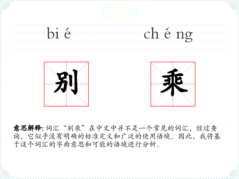 由于“别乘”不是一个常用词汇,它在不同语境下的使用可能非常有限。在某些特定的行业或地区方言中,可能会有特定的含义,但在标准汉语中,它不太常见。