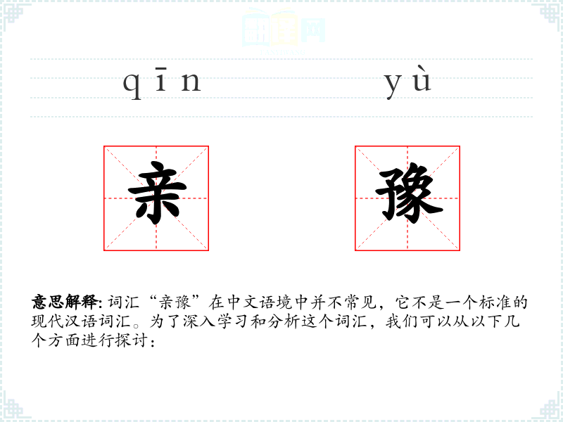 由于“亲豫”不是一个标准的现代汉语词汇,我们无法给出一个确切的基本定义。但从字面上理解,“亲”通常指亲近、亲密的关系,而“豫”则有预备、准备的意思,或者指**古代的豫州地区。将两者结合,可能指的是一种亲近的预备状态或关系。