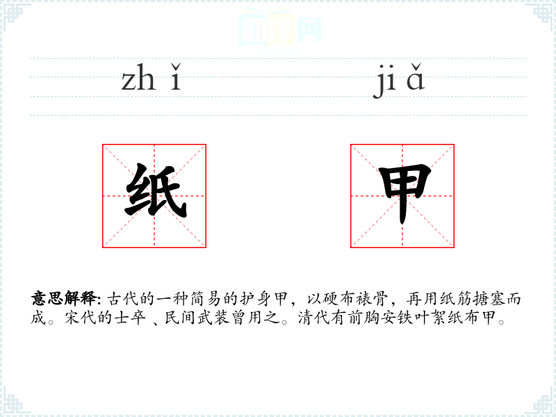 古代的一种简易的护身甲,以硬布裱骨,再用纸筋搪塞而成。宋代的士卒﹑民间武装曾用之。清代有前胸安铁叶絮纸布甲。