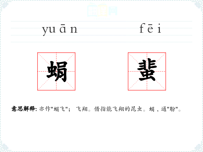 亦作"蜎飞"; 飞翔。借指能飞翔的昆虫。蜎﹐通"聁"。