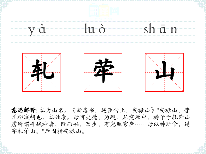 本为山名。《新唐书.逆臣传上.安禄山》"安禄山,营州柳城胡也。本姓康。母阿史德,为觋,居突厥中,祷子于轧荦山虏所谓斗战神者,既而妊。及生,有光照穹庐……母以神所命,遂字轧荦山。"后因指安禄山。