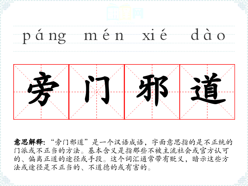 “旁门邪道”是一个汉语成语,字面意思指的是不正统的门派或不正当的方法。基本含义是指那些不被主流社会或官方认可的、偏离正道的途径或手段。这个词汇通常带有贬义,暗示这些方法或途径是不正当的、不道德的或有害的。