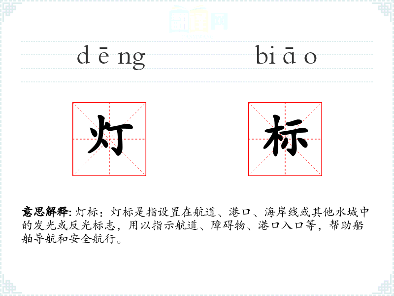 - 不同语言或文化中的对应词汇:在英语中,灯标对应的词汇是“beacon”或“lighthouse”,在法语中是“balise”,在西班牙语中是“baliza”。