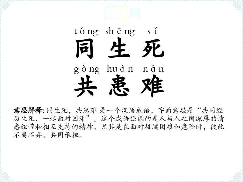 同生死,共患难 是一个汉语成语,字面意思是“共同经历生死,一起面对困难”。这个成语强调的是人与人之间深厚的情感纽带和相互支持的精神,尤其是在面对极端困难和危险时,彼此不离不弃,共同承担。