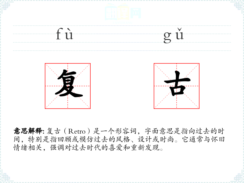 复古(Retro)是一个形容词,字面意思是指向过去的时间,特别是指回顾或模仿过去的风格、设计或时尚。它通常与怀旧情绪相关,强调对过去时代的喜爱和重新发现。