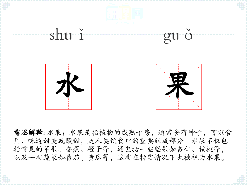"水果"的意思解释、水果是什么意思由翻译网汉语词典查词提供。