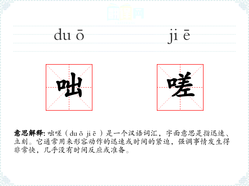 咄嗟(duō jiē)是一个汉语词汇,字面意思是指迅速、立刻。它通常用来形容动作的迅速或时间的紧迫,强调事情发生得非常快,几乎没有时间反应或准备。