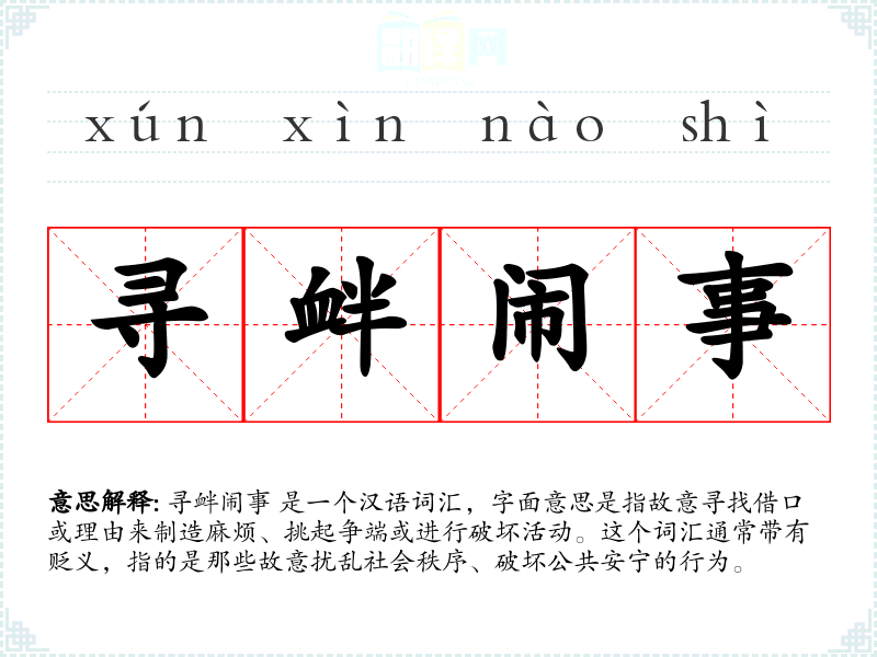 寻衅闹事 是一个汉语词汇,字面意思是指故意寻找借口或理由来制造麻烦、挑起争端或进行破坏活动。这个词汇通常带有贬义,指的是那些故意扰乱社会秩序、破坏公共安宁的行为。