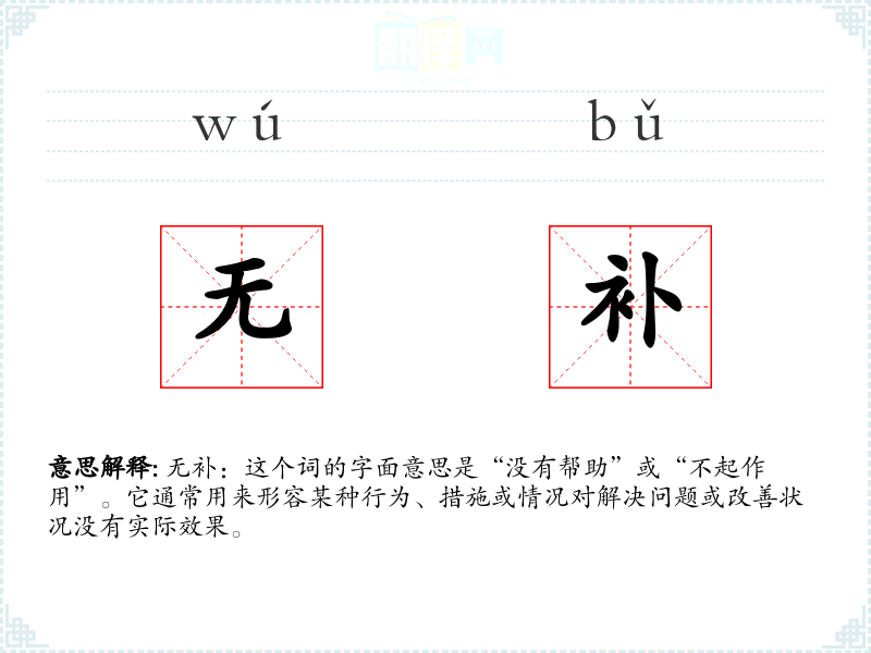 无补:这个词的字面意思是“没有帮助”或“不起作用”。它通常用来形容某种行为、措施或情况对解决问题或改善状况没有实际效果。