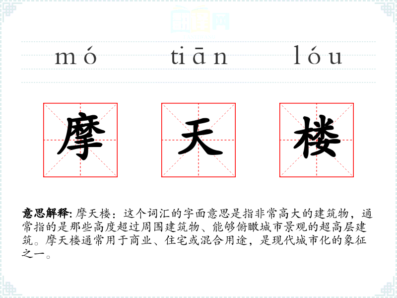 摩天楼:这个词汇的字面意思是指非常高大的建筑物,通常指的是那些高度超过周围建筑物、能够俯瞰城市景观的超高层建筑。摩天楼通常用于商业、住宅或混合用途,是现代城市化的象征之一。