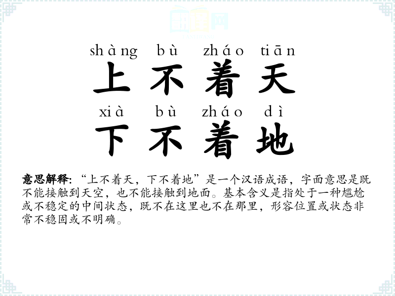 “上不着天,下不着地”是一个汉语成语,字面意思是既不能接触到天空,也不能接触到地面。基本含义是指处于一种尴尬或不稳定的中间状态,既不在这里也不在那里,形容位置或状态非常不稳固或不明确。