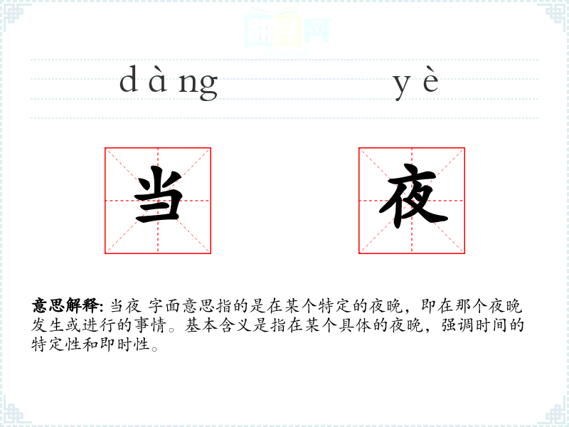 当夜 字面意思指的是在某个特定的夜晚,即在那个夜晚发生或进行的事情。基本含义是指在某个具体的夜晚,强调时间的特定性和即时性。