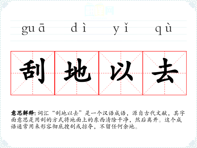 “刮地以去”字面意思是彻底清除地面上的东西,然后离开。比喻彻底搜刮或掠夺,不留任何余地。