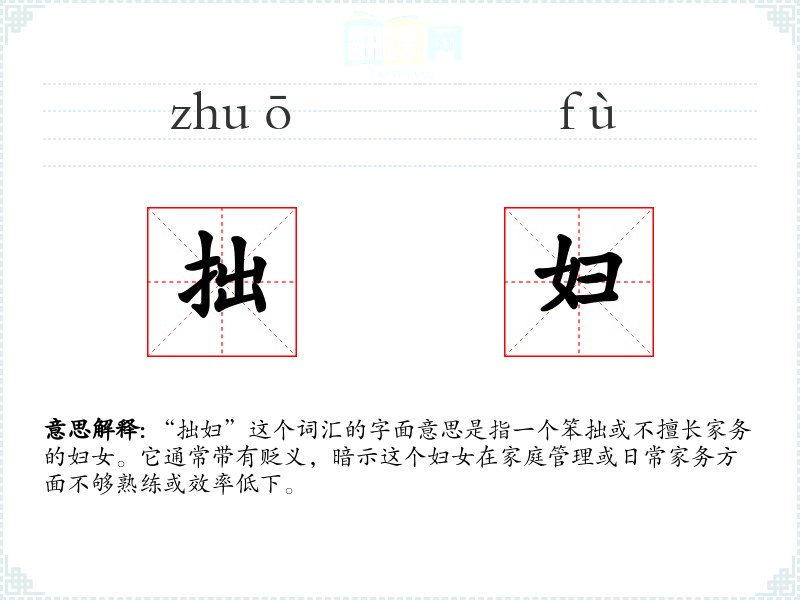 “拙妇”这个词汇的字面意思是指一个笨拙或不擅长家务的妇女。它通常带有贬义,暗示这个妇女在家庭管理或日常家务方面不够熟练或效率低下。