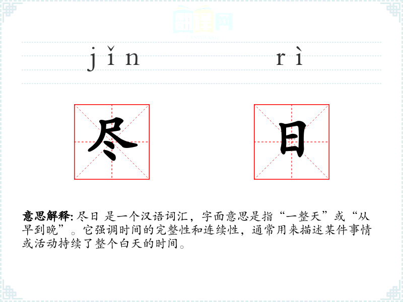 尽日 是一个汉语词汇,字面意思是指“一整天”或“从早到晚”。它强调时间的完整性和连续性,通常用来描述某件事情或活动持续了整个白天的时间。