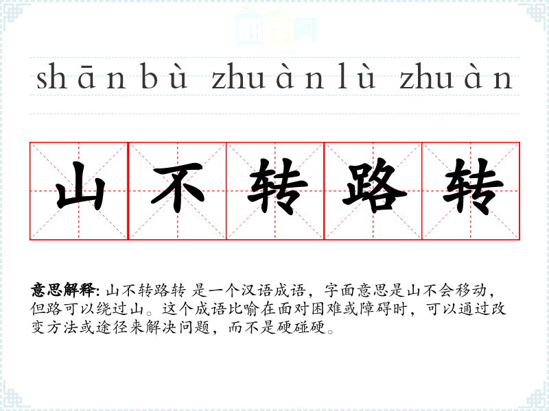 山不转路转 是一个汉语成语,字面意思是山不会移动,但路可以绕过山。这个成语比喻在面对困难或障碍时,可以通过改变方法或途径来解决问题,而不是硬碰硬。