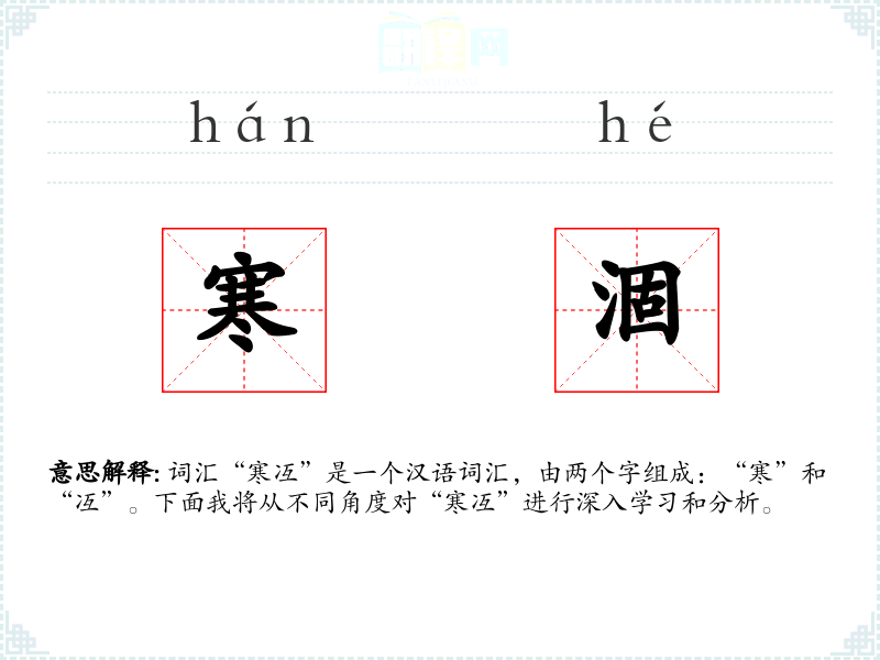 词汇“寒冱”是一个汉语词汇,由两个字组成:“寒”和“冱”。下面我将从不同角度对“寒冱”进行深入学*和分析。