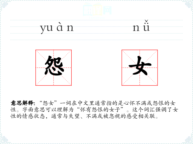 “怨女”一词在中文里通常指的是心怀不满或怨恨的女性。字面意思可以理解为“怀有怨恨的女子”。这个词汇强调了女性的情感状态,通常与失望、不满或被忽视的感受相关联。