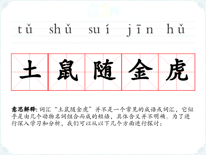 词汇“土鼠随金虎”并不是一个常见的成语或词汇,它似乎是由几个动物名词组合而成的短语,具体含义并不明确。为了进行深入学*和分析,我们可以从以下几个方面进行探讨:
