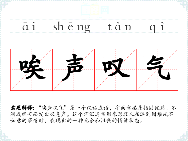 - 文学:在文学作品中,“唉声叹气”常被用来描绘人物的内心世界,增强情感的表达。例如,在小说中描述主人公面对挫折时的反应。