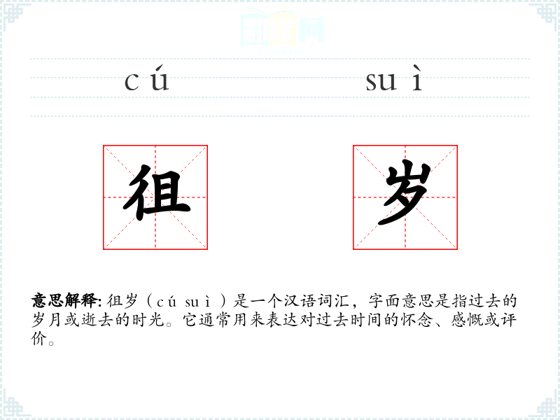 徂岁(cú suì)是一个汉语词汇,字面意思是指过去的岁月或逝去的时光。它通常用来表达对过去时间的怀念、感慨或评价。