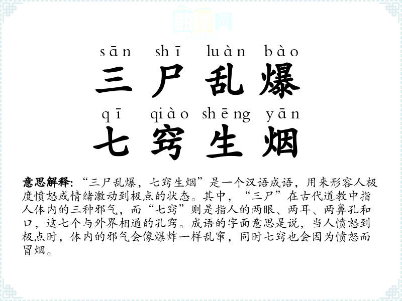 “三尸乱爆,七窍生烟”是一个汉语成语,用来形容人极度愤怒或情绪激动到极点的状态。其中,“三尸”在古代道教中指人体内的三种邪气,而“七窍”则是指人的两眼、两耳、两鼻孔和口,这七个与外界相通的孔窍。成语的字面意思是说,当人愤怒到极点时,体内的邪气会像爆炸一样乱窜,同时七窍也会因为愤怒而冒烟。