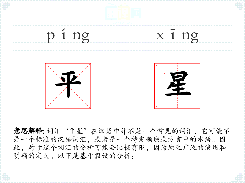 由于“平星”不是一个标准词汇,我们无法提供一个确切的字面意思和基本含义。它可能是由“平”和“星”两个字组合而成的,其中“平”可能指的是平坦、平等或平静,而“星”通常指的是天上的星星。