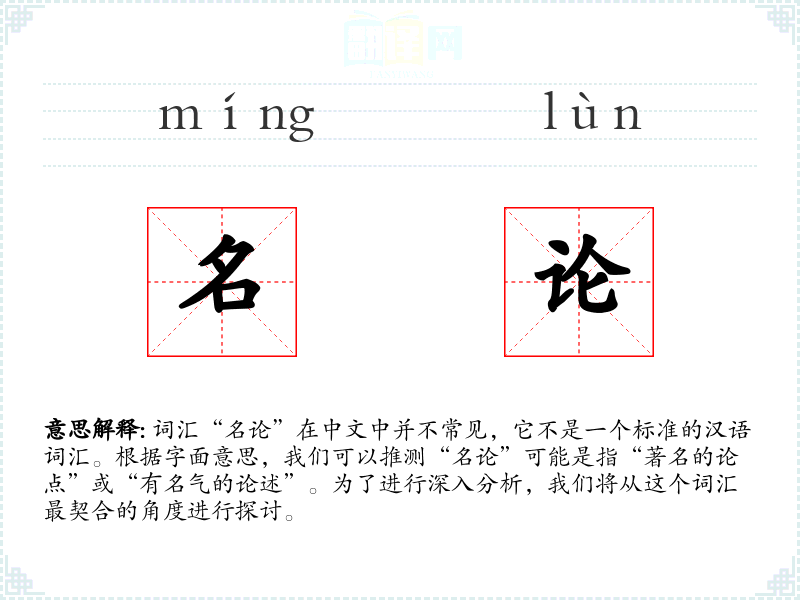 词汇“名论”在中文中并不常见,它不是一个标准的汉语词汇。根据字面意思,我们可以推测“名论”可能是指“著名的论点”或“有名气的论述”。为了进行深入分析,我们将从这个词汇最契合的角度进行探讨。
