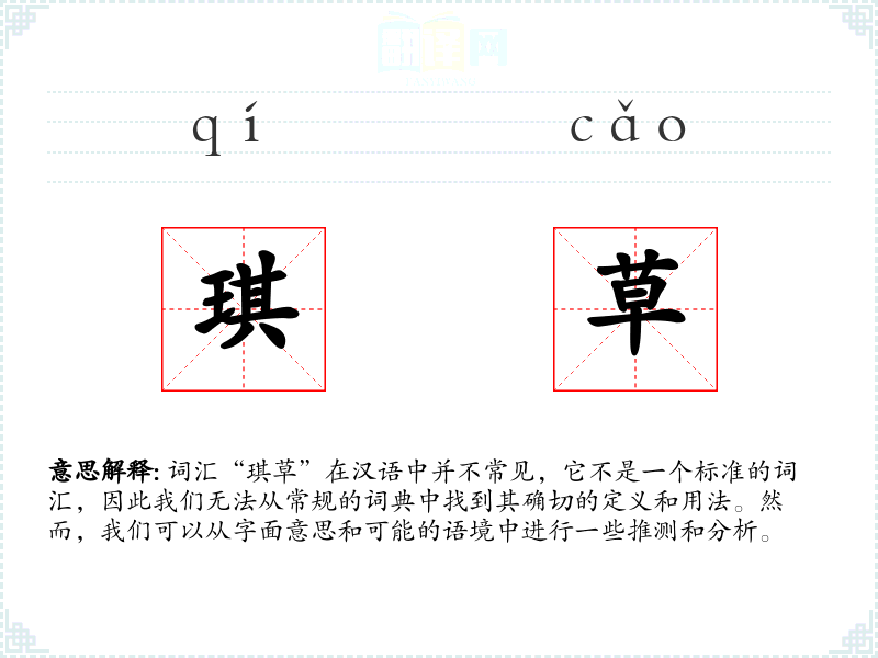 词汇“琪草”在汉语中并不常见,它不是一个标准的词汇,因此我们无法从常规的词典中找到其确切的定义和用法。然而,我们可以从字面意思和可能的语境中进行一些推测和分析。