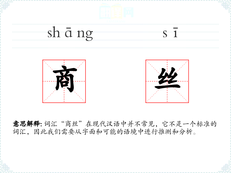 “商丝”字面意思可能是指与商业或贸易相关的丝织品。在这里,“商”可能指的是商业活动,而“丝”则指的是丝绸或丝织品。