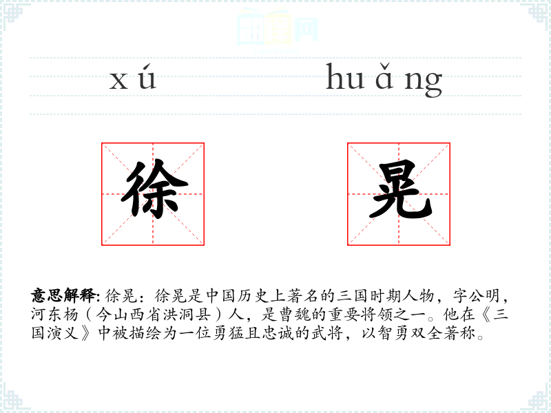 徐晃的名字来源于其出生地的地名“徐”,“晃”可能取自其光明磊落的性格。在历史文献中,徐晃的形象随着时间的推移而逐渐丰富,从简单的军事将领到具有复杂性格的历史人物。