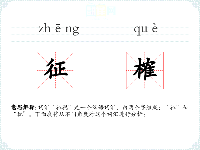词汇“征税”是一个汉语词汇,由两个字组成:“征”和“税”。下面我将从不同角度对这个词汇进行分析: