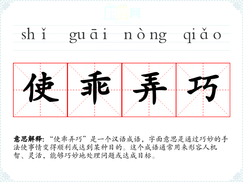 “使乖弄巧”是一个汉语成语,字面意思是通过巧妙的手法使事情变得顺利或达到某种目的。这个成语通常用来形容人机智、灵活,能够巧妙地处理问题或达成目标。