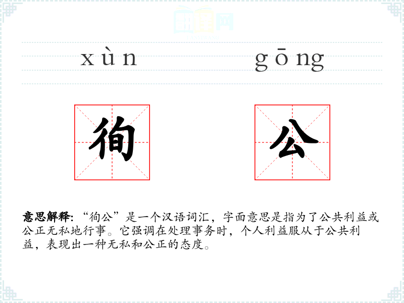 “徇公”是一个汉语词汇,字面意思是指为了公共利益或公正无私地行事。它强调在处理事务时,个人利益服从于公共利益,表现出一种无私和公正的态度。