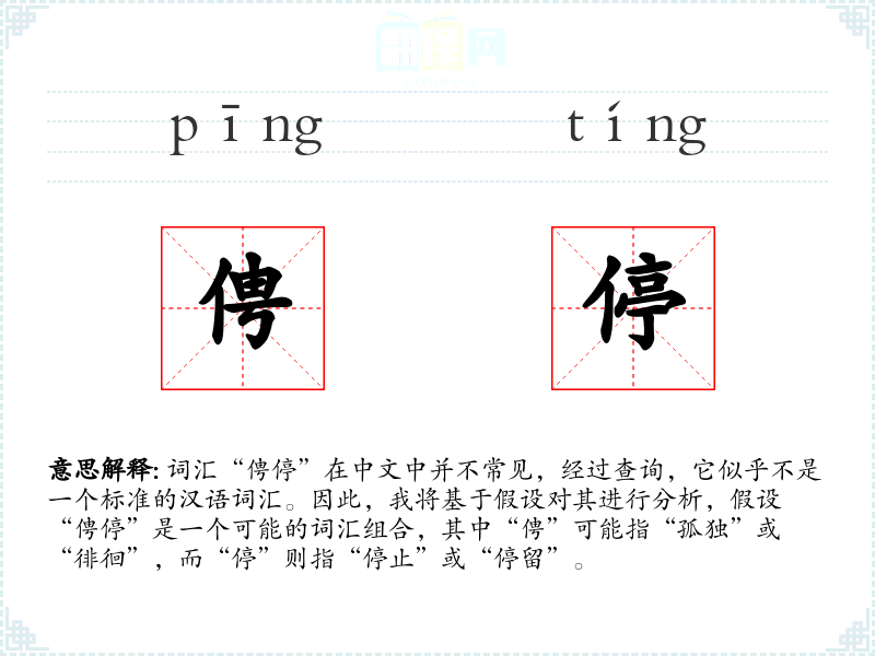 词汇“俜停”在中文中并不常见,经过查询,它似乎不是一个标准的汉语词汇。因此,我将基于假设对其进行分析,假设“俜停”是一个可能的词汇组合,其中“俜”可能指“孤独”或“徘徊”,而“停”则指“停止”或“停留”。