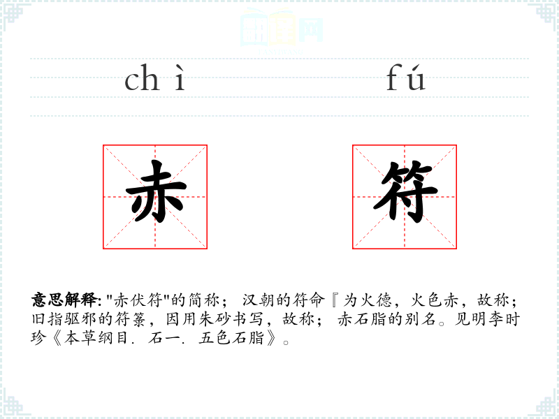 "赤伏符"的简称; 汉朝的符命『为火德,火色赤,故称; 旧指驱邪的符箓,因用朱砂书写,故称; 赤石脂的别名。见明李时珍《本草纲目.石一.五色石脂》。
