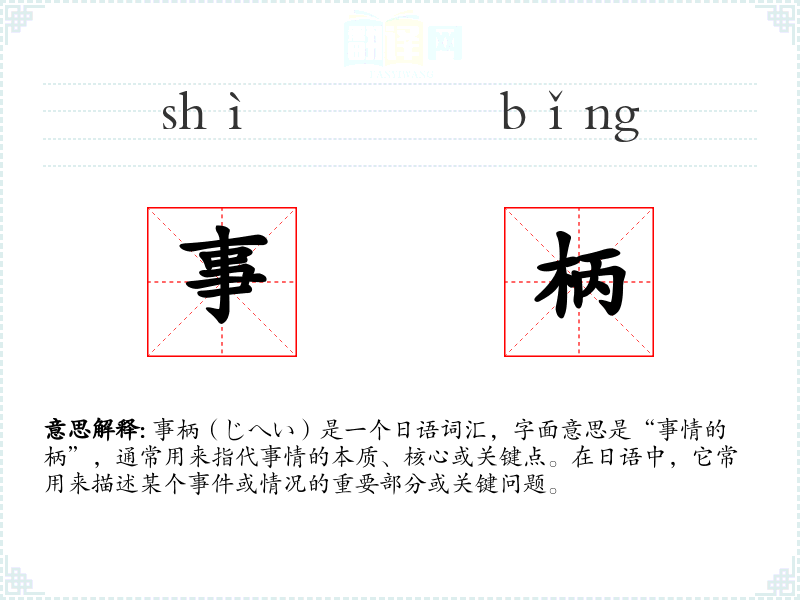 - 专业领域:在法律、商业或技术领域,事柄可能特指某个案件、交易或技术问题的关键点。